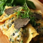 - Drain the ravioli and toss in the butter sauce. Plate 5–6 ravioli per serving, drizzle with sauce, season with black pepper, and garnish with shaved truffle.
