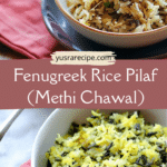 Fenugreek Rice Pilaf, also known as Methi Chawal, is a comforting Sindhi-style rice dish made with fragrant basmati rice, fresh fenugreek leaves, tomatoes, ginger, garlic, and turmeric. This simple yet flavorful vegetarian and vegan recipe brings together wholesome greens and aromatic spices in a nourishing one-pot meal that pairs beautifully with yogurt, lentils, or vegetable curries.