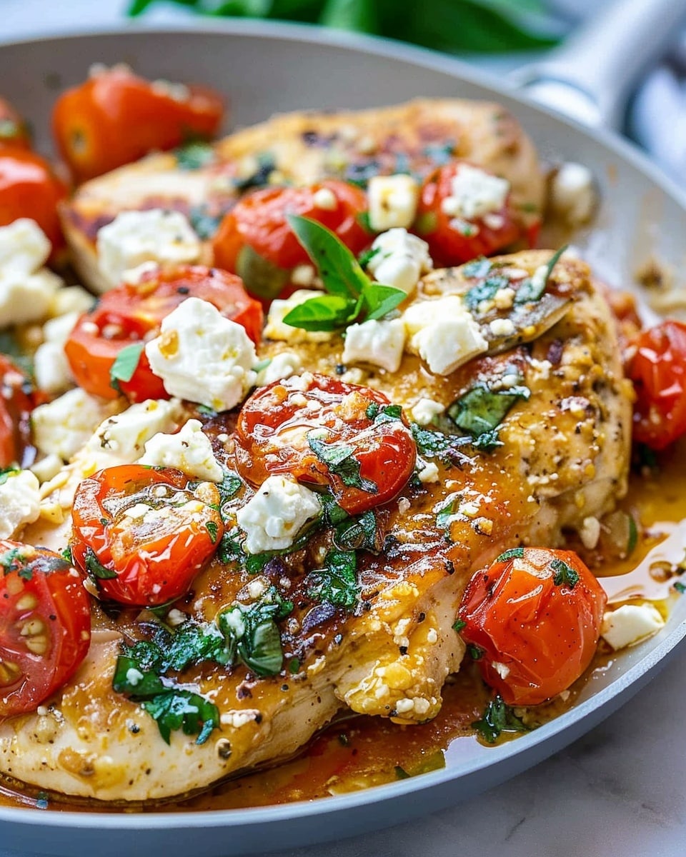 A flavorful one-skillet Mediterranean-inspired dish featuring seared chicken breasts simmered in a garlicky tomato sauce and finished with tangy feta and fresh herbs.