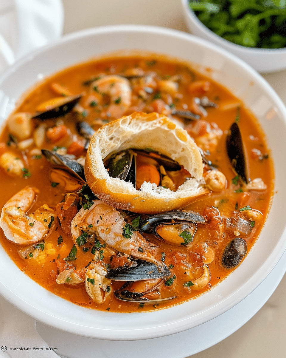 Bouillabaisse is a traditional seafood soup from southern France, known for its aromatic broth and mix of fish and shellfish.