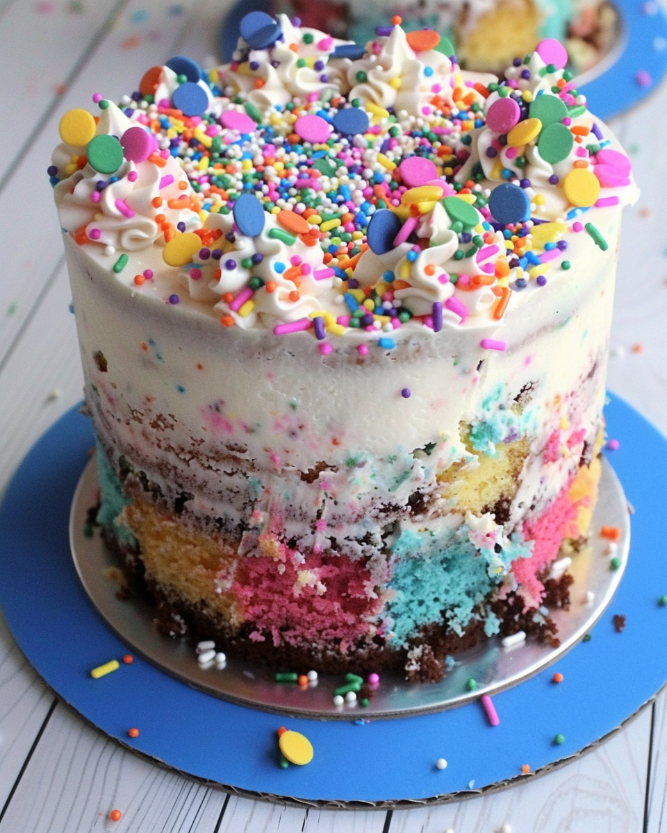 - Prepare the cake batter according to the package instructions. Gently fold in ½ cup of rainbow sprinkles.