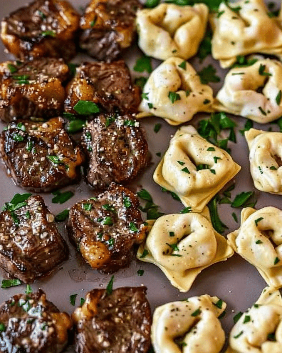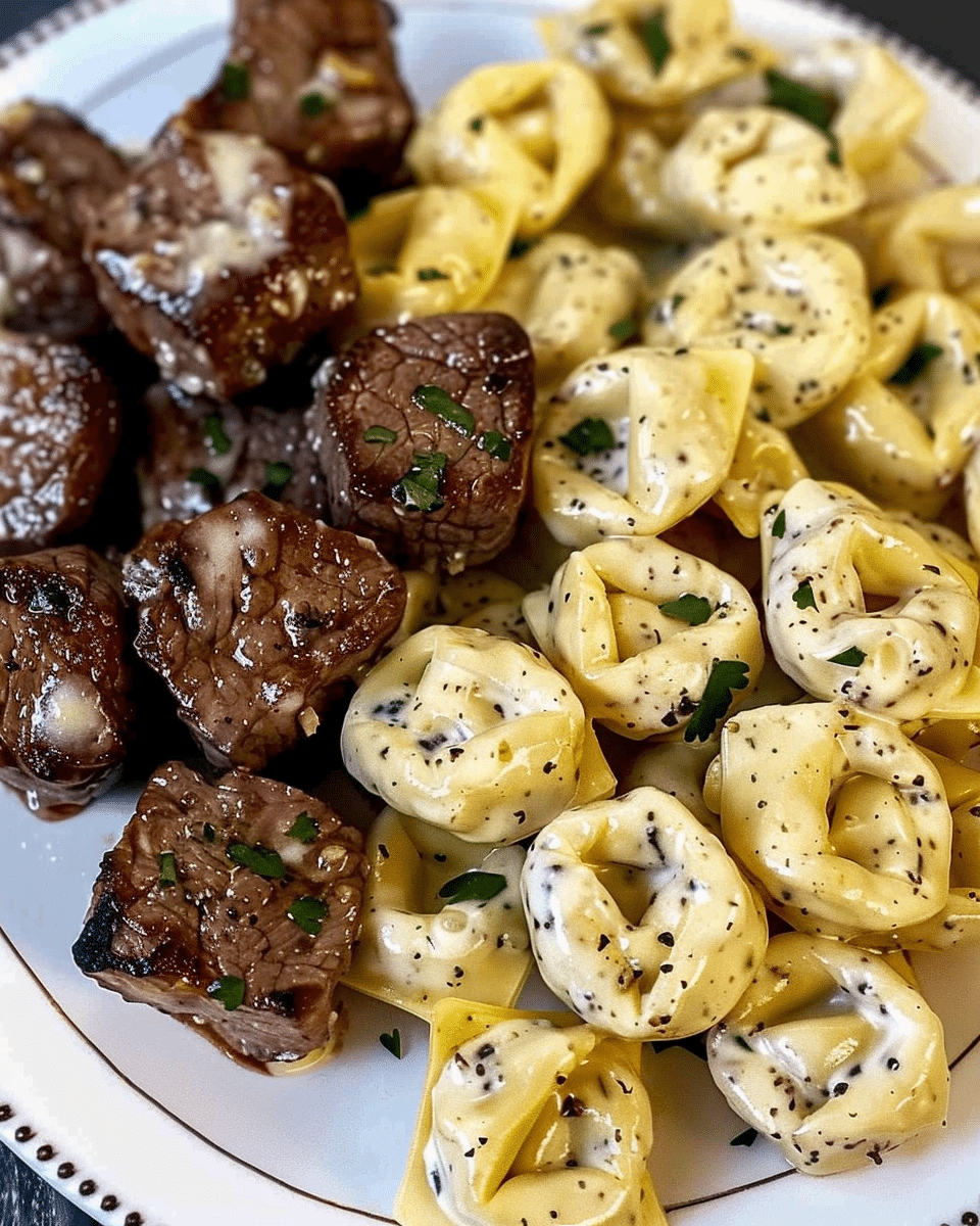 A rich, comforting dish that brings together tender steak bites seared in butter and garlic with pillowy cheese tortellini bathed in a luscious Alfredo sauce.