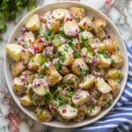 Store leftovers in an airtight container in the refrigerator for up to 3 days. To reheat, warm gently in a skillet over low heat or in the microwave, adding a splash of broth or water to keep the potatoes moist. This salad can also be enjoyed cold or at room temperature.