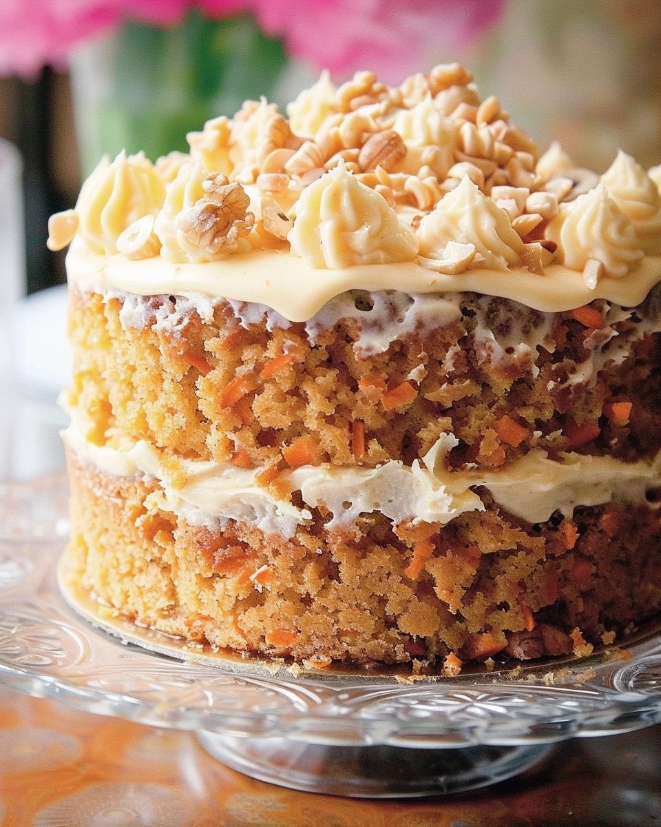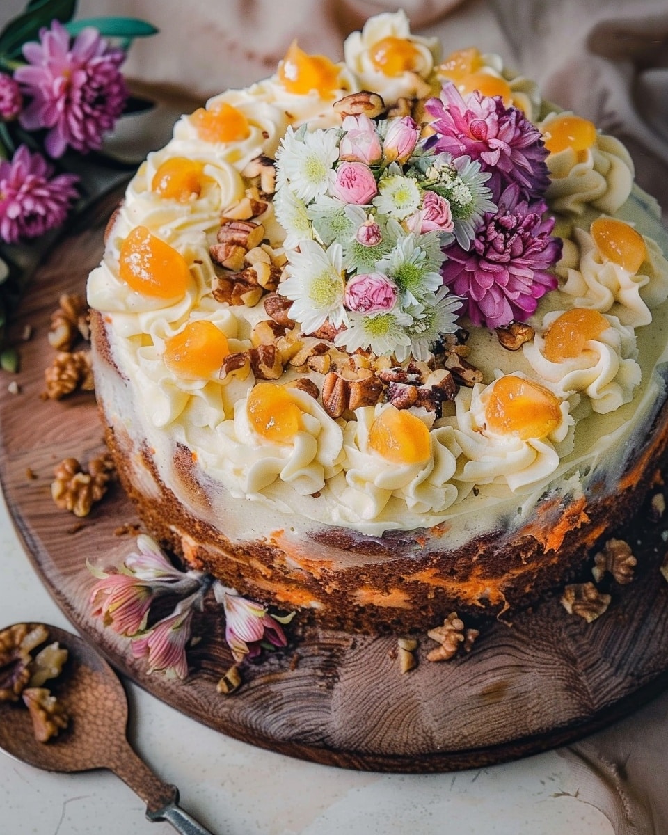 This cake offers a lovely twist on a classic carrot cake. The ginger gives it a deeper, warmer flavor than the usual cinnamon-led version, while the walnuts add texture and richness. The cake itself is moist without being overly heavy, and the topping is spread only over the top, which keeps the balance just right. It is also easy to make in one tin, simple to decorate, and ideal for gatherings because it slices neatly and keeps well for several days.