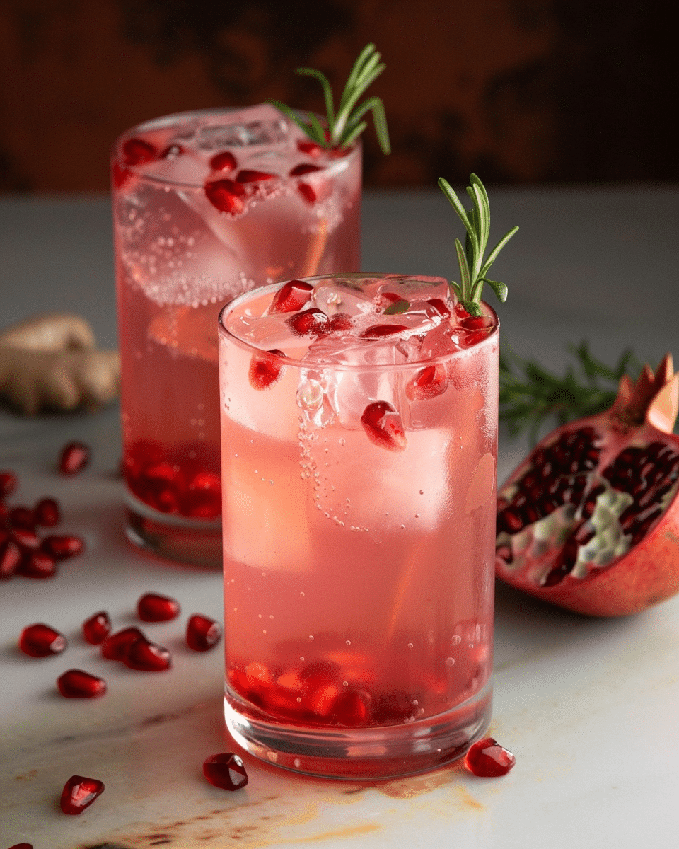 The Ginger Pomegranate Fizz is a vibrant, refreshing drink that combines tangy pomegranate, zesty lemon, a hint of honey, fizzy spiced soda, and fresh rosemary for a beautifully balanced and festive beverage. Perfect for celebrations or a relaxing night in.