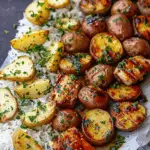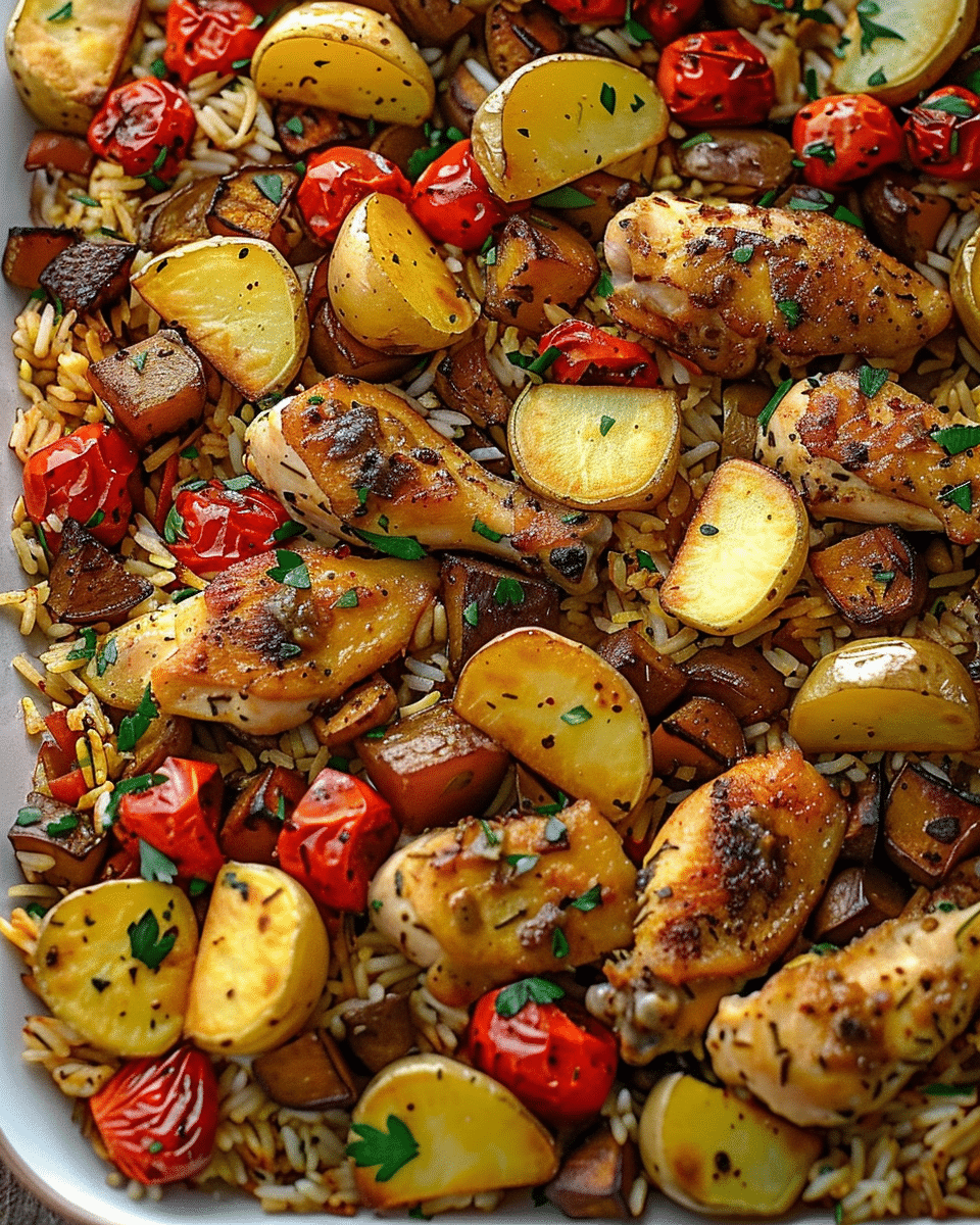This restaurant-quality dish features juicy glazed chicken filets paired with crispy garlic potatoes, fluffy basmati rice, roasted tomatoes, and sautéed mushrooms. It’s a complete, comforting, and visually stunning meal perfect for weeknights or entertaining.
