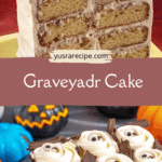 Graveyard Cake is a spooky Halloween dessert made with creamy chocolate pudding, crushed chocolate sandwich cookies as ‘dirt,’ and decorated with gummy worms, tombstone cookies, and candy pumpkins. It’s fun, festive, and easy to assemble — a perfect no-bake treat for parties and gatherings.