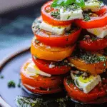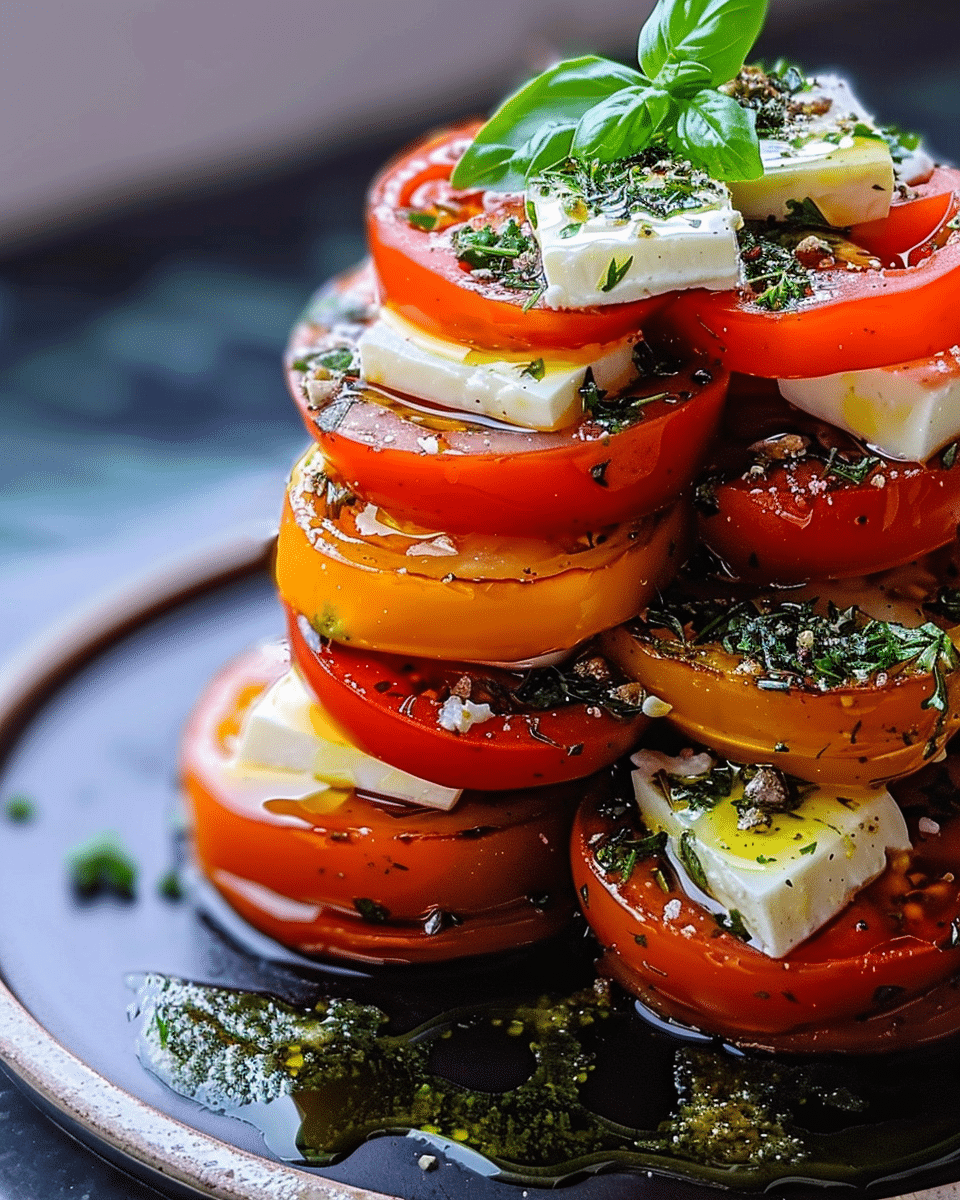This Greek Feta Salad Tower is a fresh, elegant take on a Mediterranean classic. Juicy tomatoes, briny olives, and creamy feta are layered into a beautiful stack, then finished with a fragrant herb-infused olive oil. It’s light, vibrant, and perfect as a starter or a simple meal when you want something refreshing yet satisfying.