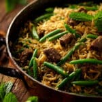 This green bean and lamb rice is a comforting one-pot meal that brings together tender grains of basmati rice, softly cooked green beans, and delicately spiced lamb. Balanced and nourishing, it delivers vegetables, protein, and carbohydrates in one satisfying dish inspired by Middle Eastern home cooking.