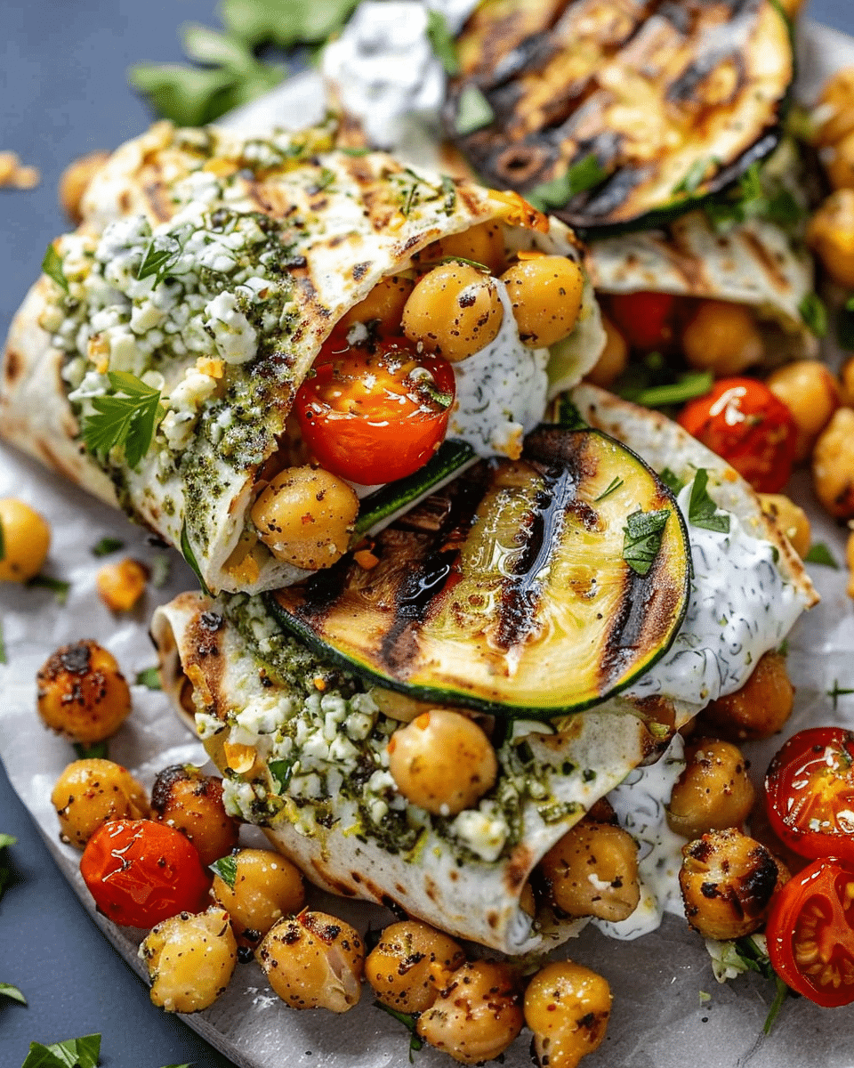 To assemble, spread a generous layer of herbed yogurt down the center of each tortilla. Add the chickpeas, top with grilled zucchini slices, and finish with crumbled feta.