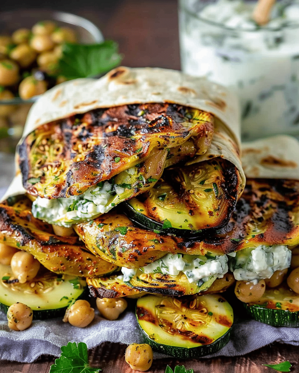 A refreshing, vibrant, and nourishing wrap filled with smoky grilled zucchini, tangy feta, spiced chickpeas, and a creamy herbed yogurt sauce—all bundled in a soft whole-wheat tortilla. This wrap is quick to prepare, full of Mediterranean-inspired flavors, and perfect for lunch, dinner, or meal prep.