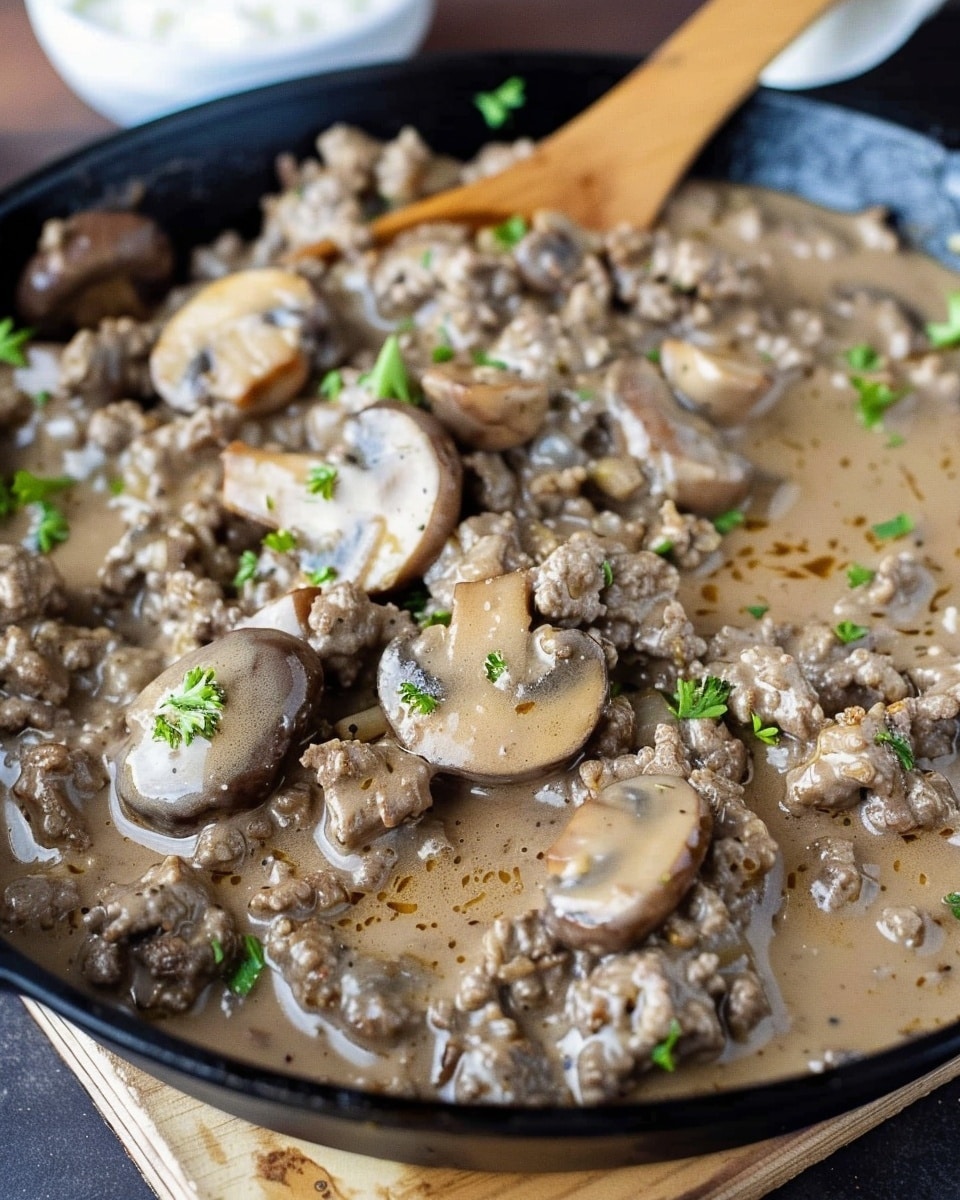 This cozy skillet dinner combines ground beef, mushrooms, and rice into one easy, flavorful meal. Perfect for weeknights, it’s almost hands-off cooking with minimal cleanup. Add a dollop of sour cream and some chives or green onions for an extra touch of comfort.