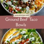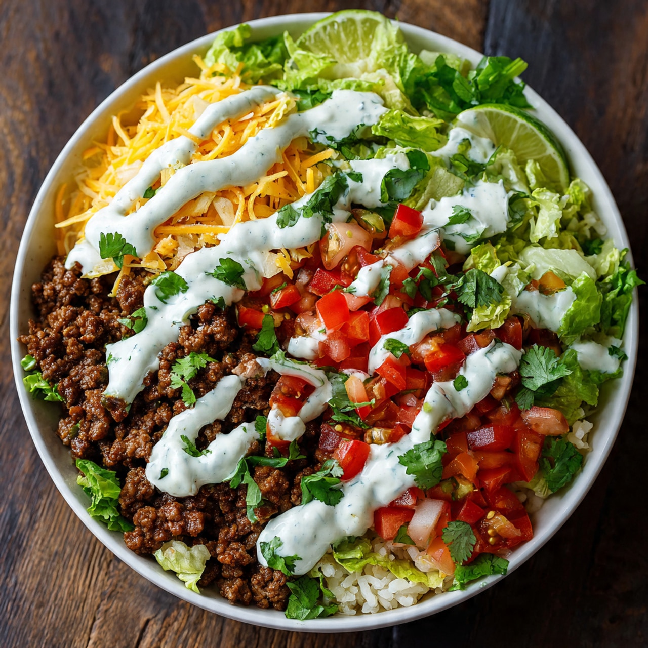Ground beef taco bowls with cilantro lime crema are a vibrant, Tex-Mex inspired dish featuring seasoned beef, fluffy cilantro lime rice, sautéed vegetables, and a tangy yogurt-based crema, all assembled in one colorful and satisfying bowl.
