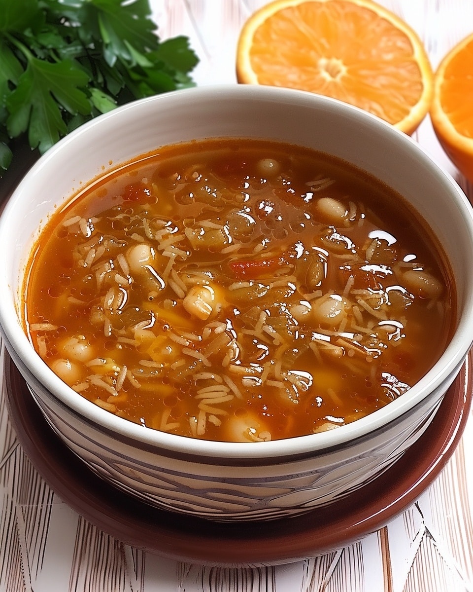 A traditional Moroccan soup made with tomatoes, lentils, chickpeas, fragrant spices, fresh herbs, and vermicelli noodles, creating a rich and comforting dish often enjoyed during Ramadan.