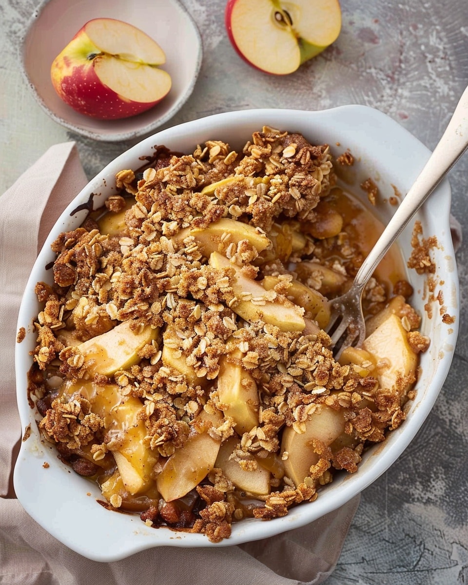 Make-ahead: prep apple filling in the dish and refrigerate up to 2 days; keep topping separate, then bake apples first and add topping to finish.