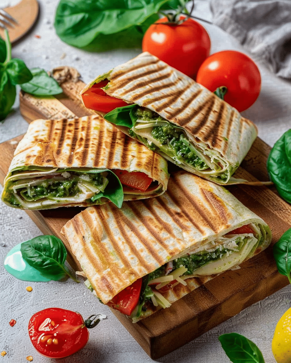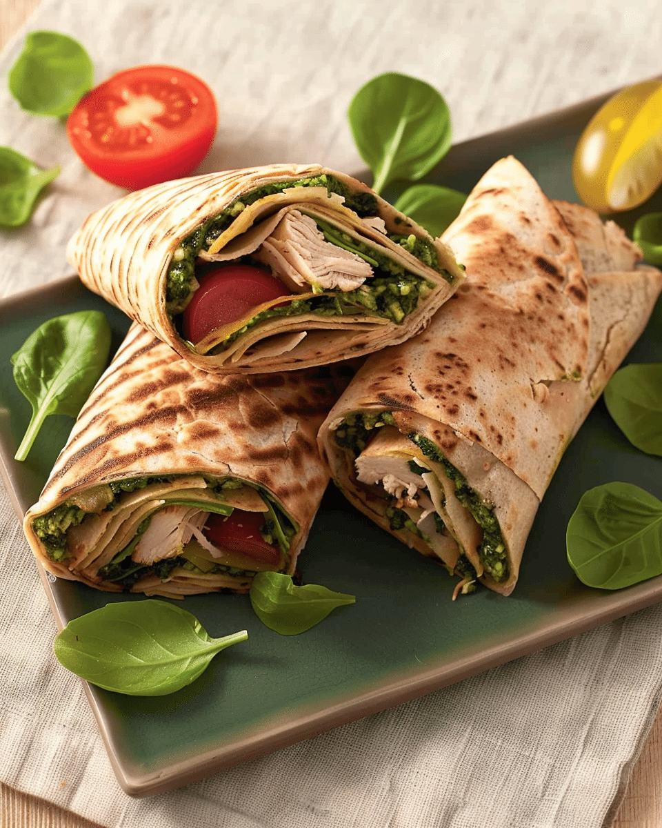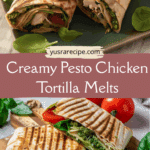 A light, wholesome, and incredibly satisfying lunch that’s ready in just 10 minutes! These healthy folded pesto chicken tortilla wraps combine the creamy, herby flavor of basil pesto with tender chicken, melted cheese, and crisp baby spinach — all wrapped in a golden, crispy tortilla. Perfect for busy days when you want something both quick and nourishing.