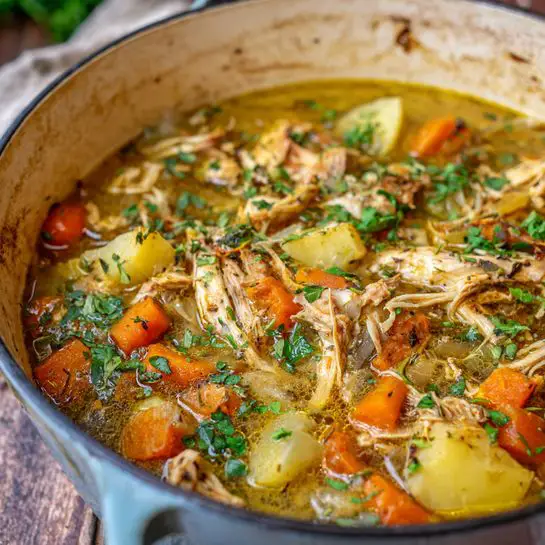 Cover the pot with a lid and transfer it to the oven. Cook for about 1½ hours, or until the turkey and potatoes are very tender and the broth has thickened.