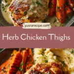 Herb Chicken Thighs with Gravy, Buttery Mashed Potatoes & Roasted Carrots is a cozy complete dinner featuring crispy, herb-seasoned chicken thighs finished in the oven, a silky pan gravy, creamy mashed potatoes, and sweet caramelized carrots.