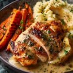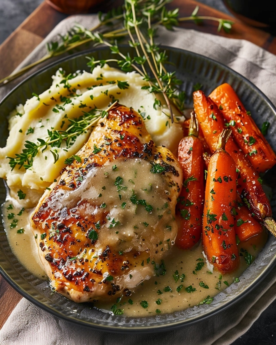 This comforting plate brings together crispy, herb-seasoned chicken thighs, a silky pan gravy, creamy mashed potatoes, and sweet roasted carrots. It’s a complete dinner that feels special but stays simple enough for a weeknight.