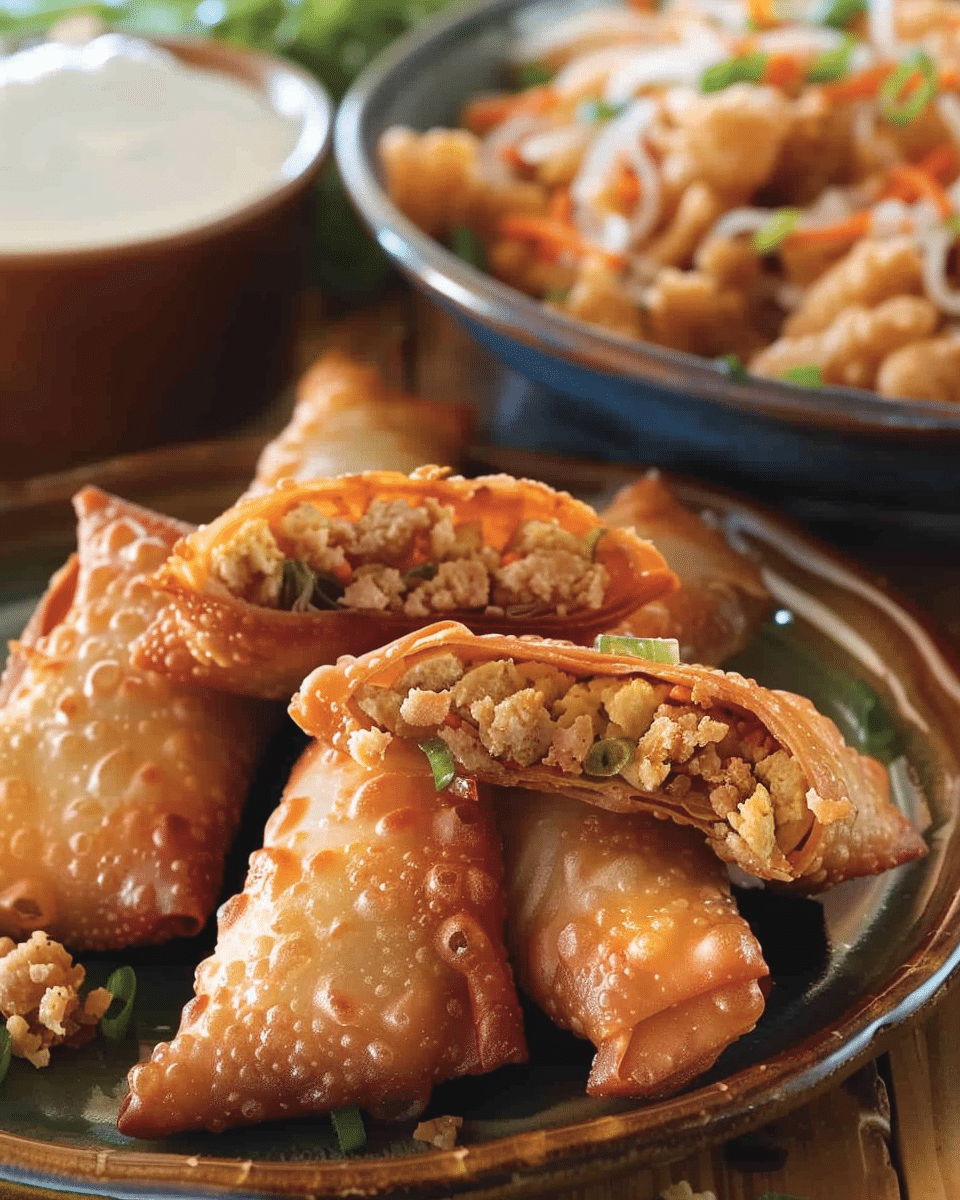 Crispy, golden Homemade Chicken Egg Rolls filled with savory shredded chicken and crisp vegetables—perfect as appetizers or a full meal with rice or noodles.