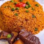 A fragrant and colorful West African dish made with long-grain rice simmered in a rich tomato-pepper base, served with tender, well-seasoned diced beef. Perfect for lunch, dinner, or festive gatherings.
