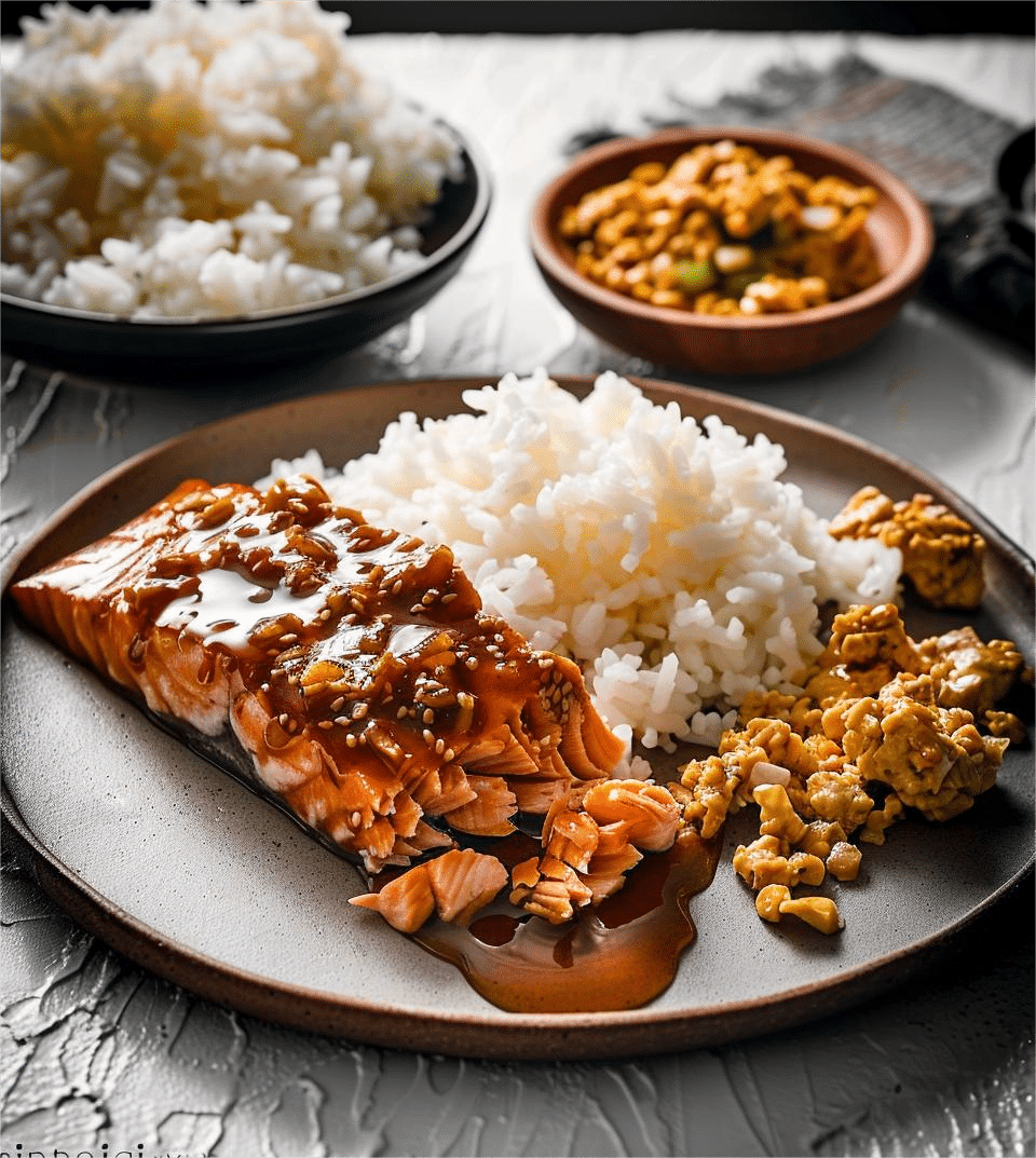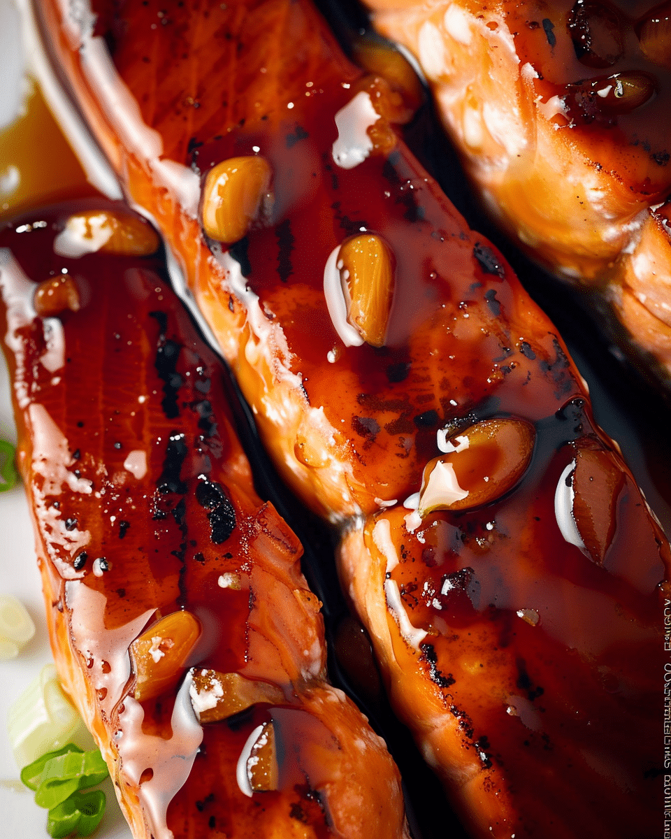 Once the salmon is done, I remove it from the oven and immediately drizzle the thickened glaze over each fillet. I garnish with chopped green onions or sesame seeds, and serve it hot with a side of rice and vegetables.