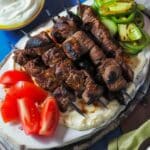 A simplified Turkish Iskender kebab featuring tender marinated beef served over crispy toasted bread cubes, topped with rich tomato sauce, melted butter, grilled vegetables, and creamy yogurt.