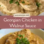 A traditional Georgian dish featuring tender chicken served in a creamy walnut sauce infused with garlic, onion, and warm spices, creating a rich and aromatic meal often enjoyed chilled.