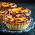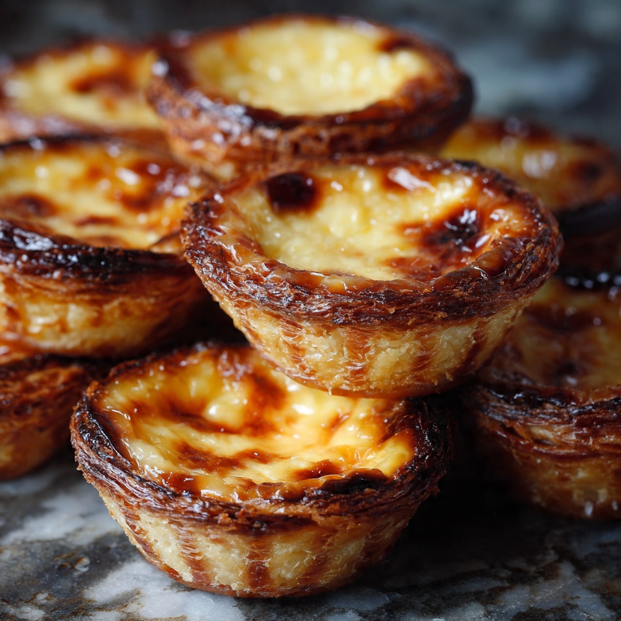 These authentic Portuguese custard tarts (Pastéis de Nata) feature ultra-crispy puff pastry filled with silky, lemon-scented custard, caramelized to perfection. A simple yet indulgent treat with rich texture and traditional flavor.