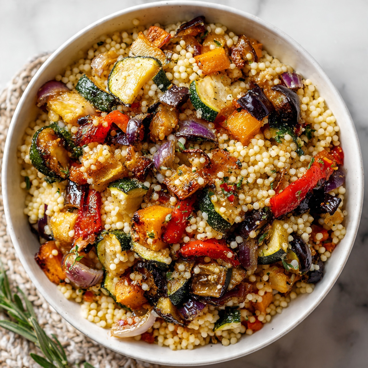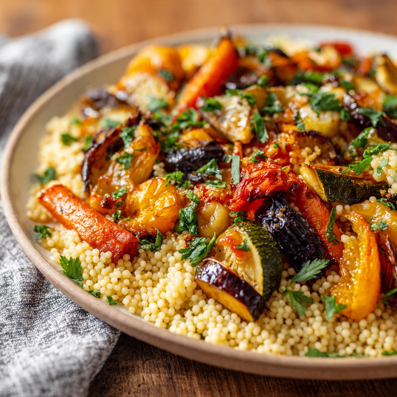 This recipe is easy to prepare and relies on simple pantry ingredients. The roasted vegetables add depth and natural sweetness, while the spices gently enhance the couscous without overpowering it. It’s customizable with whatever vegetables you have on hand, can be served warm or cold, and pairs well with chicken, lamb, or beef. It’s also a great make-ahead option for busy weeks.