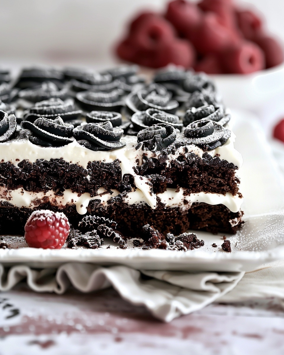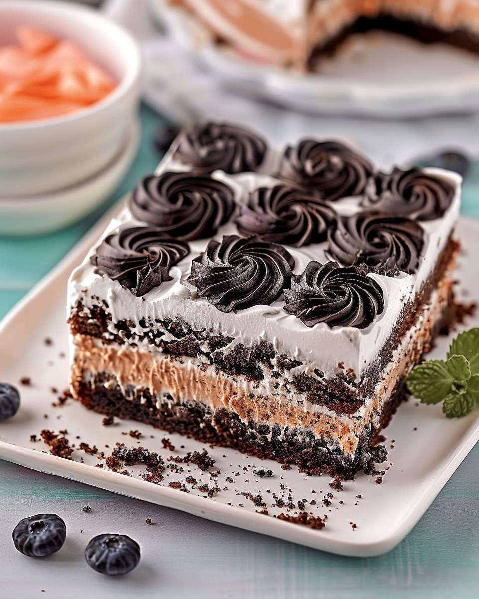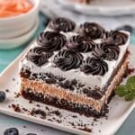 A classic no-bake icebox cake made with layers of whipped cream, chocolate pudding, and cookies that soften into a cake-like texture after chilling, creating a creamy, refreshing dessert.