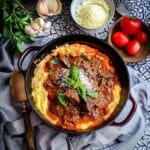 Slow-cooked braised beef in a rich Italian tomato and garlic sauce served over creamy parmesan polenta. This dish is the ultimate comfort food, with tender meat that melts in my mouth and a luxurious, cheesy polenta that soaks up every bit of the sauce. It reminds me of Sundays at home with family, full of laughter, warmth, and a big, hearty meal.