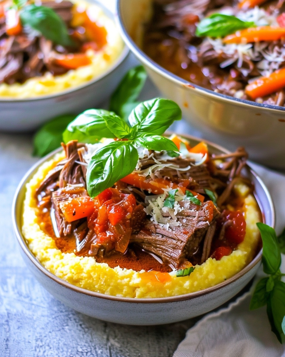 A comforting Italian-style braised beef ragu slow-cooked in a rich tomato, garlic, and basil sauce, served over creamy parmesan polenta for a hearty and flavorful meal.