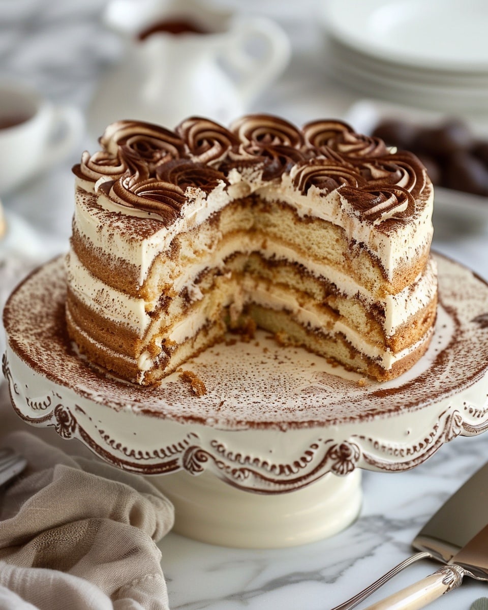 This cake delivers the familiar taste of tiramisu in a sliceable, celebratory format. The sponge stays moist without being heavy, the mascarpone cream is rich yet airy, and the espresso adds depth without bitterness. It is perfect for gatherings, special occasions, or when you want a refined dessert that still feels homemade.