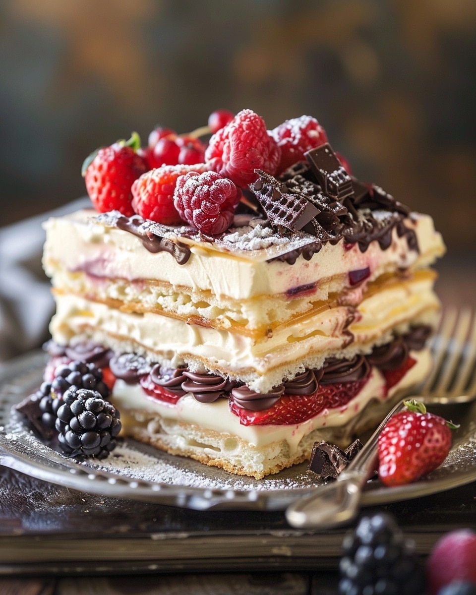 Italian Zuppa Inglese is a classic layered dessert featuring sponge cake soaked in syrup, layered with rich vanilla and chocolate custards, and topped with fruit and chocolate for an elegant and nostalgic treat.