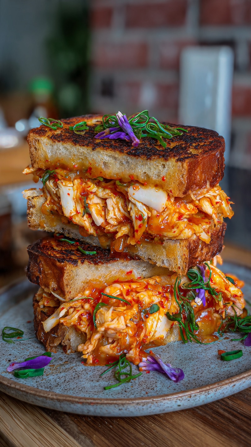 A bold, cheesy grilled sandwich featuring tender shredded chicken, spicy kimchi, and creamy mayo, melted between provolone and havarti cheese on golden, buttery bread. A quick and satisfying fusion twist on the classic melt.