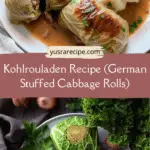 Kohlrouladen, or German stuffed cabbage rolls, are tender cabbage leaves filled with seasoned ground beef and simmered in a creamy, savory broth. A comforting and traditional main dish perfect for family meals.