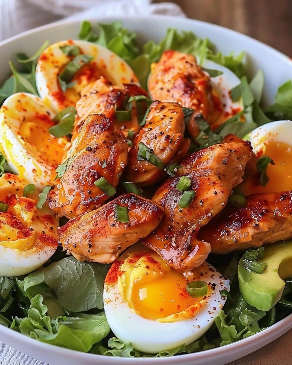 This nourishing and vibrant power bowl brings together lean protein, healthy fats, and crisp vegetables in one satisfying meal. With juicy seasoned chicken, creamy avocado, protein-rich eggs, and fresh greens, it’s a simple yet balanced dish that’s perfect for a quick lunch or a light dinner. Every bite delivers freshness and flavor while keeping things wholesome and energizing.
