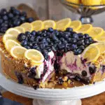 This Lemon Blueberry Crumble Cheesecake features a creamy lemon-infused cheesecake swirled with homemade blueberry jam, all set over a buttery Nilla wafer crust and finished with a zesty, crunchy crumble topping.