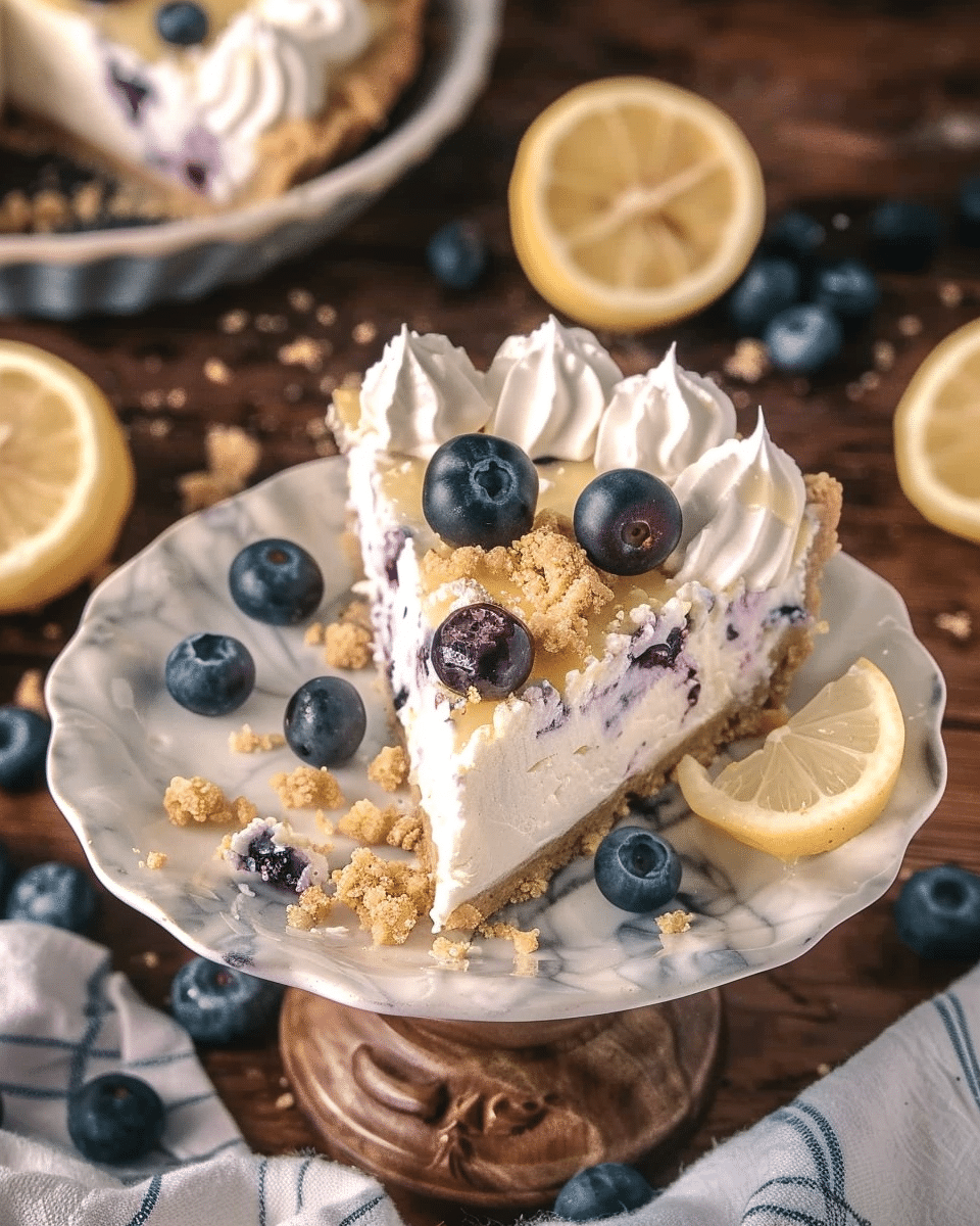 Whip cream and serve: Beat heavy cream with powdered sugar to stiff peaks. Unmold cheesecake, pipe whipped cream, and decorate with fresh blueberries and lemon slices.