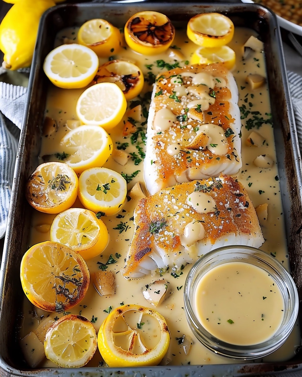 A light and flavorful baked cod dish featuring tender, flaky fillets in a rich lemon butter sauce infused with garlic and fresh herbs. Quick to prepare and perfect for both weeknight dinners and elegant meals.