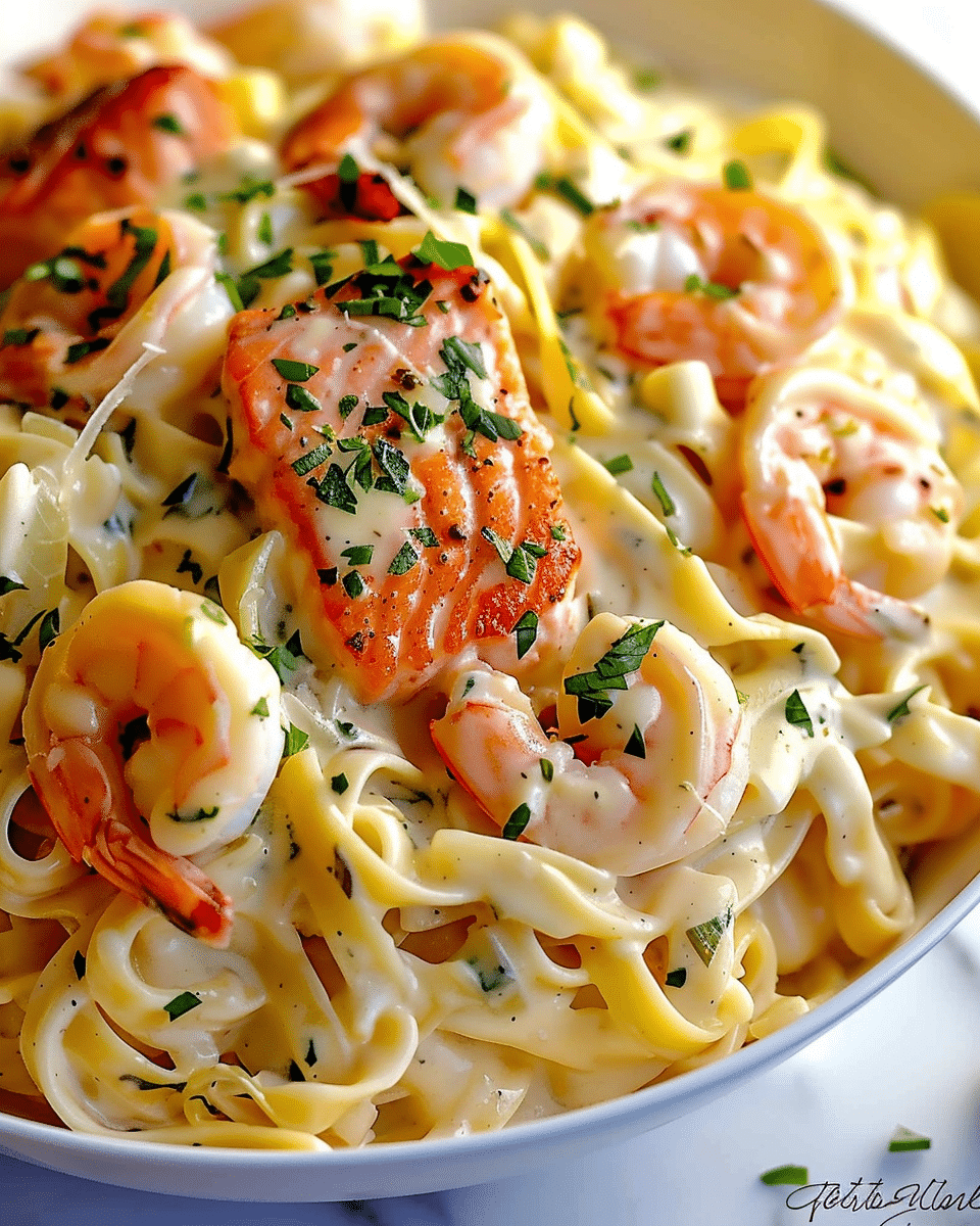 Lemon Garlic Salmon & Shrimp Alfredo is a rich, creamy pasta dish featuring tender salmon and shrimp in a zesty garlic-infused Alfredo sauce. It’s a comforting yet elegant meal perfect for weeknights or special occasions.