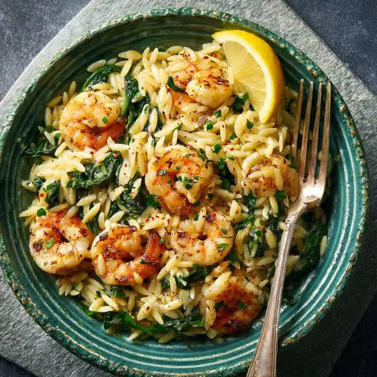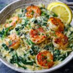 Lemon garlic shrimp with spinach orzo is a Mediterranean-inspired one-pan meal combining tender shrimp, creamy orzo, fresh spinach, and zesty lemon. It’s a light yet satisfying dish that’s perfect for weeknight dinners or casual entertaining.