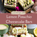 These lemon pistachio cheesecake bars are a vibrant, creamy treat featuring a zesty lemon cookie–pistachio crust and a silky cheesecake layer enriched with pistachio cream. Bright, refreshing, and irresistibly smooth, they are perfect for any lemon lover looking for a unique twist.