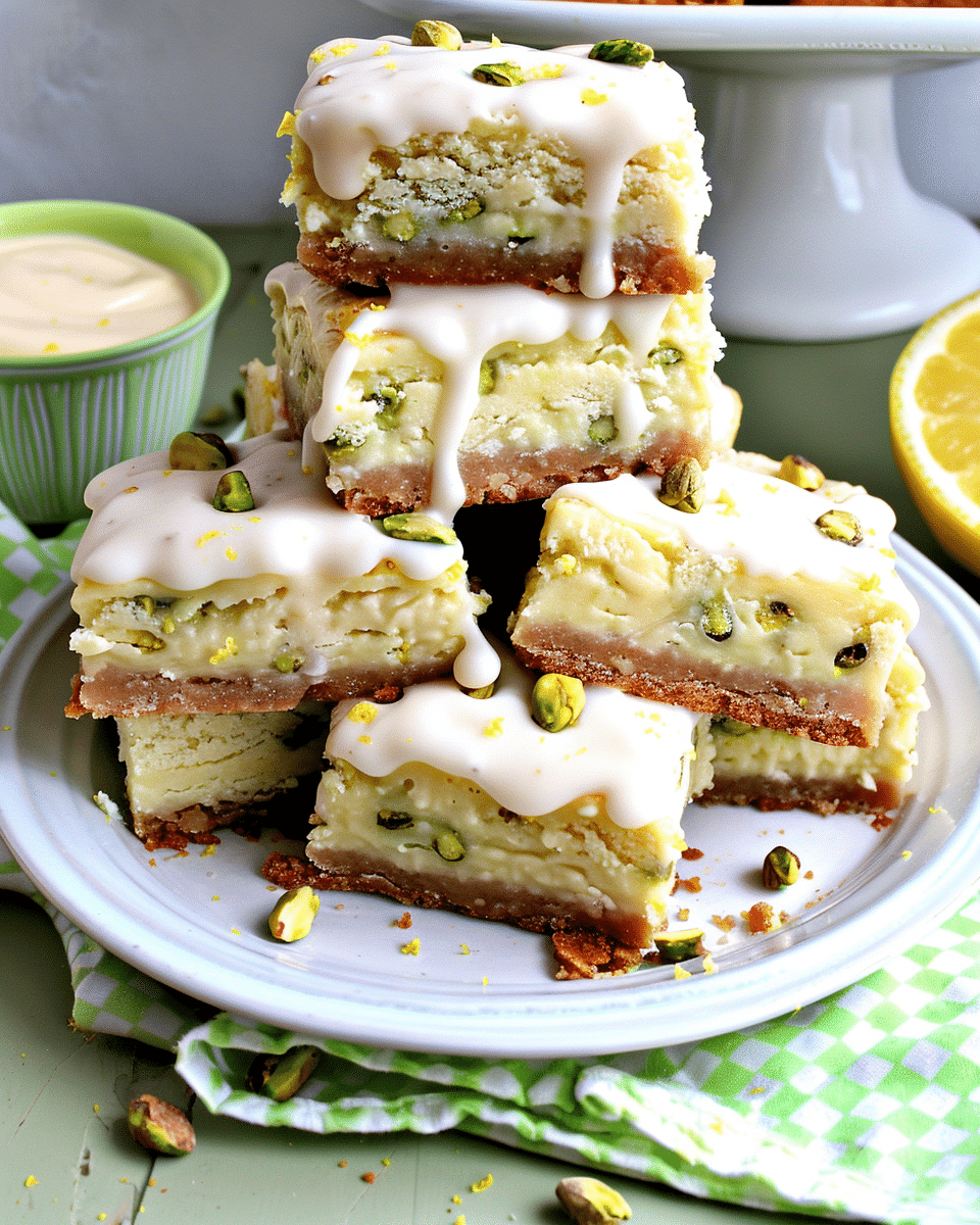 Creamy, zesty lemon pistachio cheesecake bars with a crunchy lemon cookie-pistachio crust and a rich pistachio-infused cheesecake filling—perfectly chilled and easy to slice.