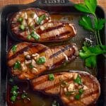 Brush the mushroom steaks with oil and grill over medium heat for about 5 minutes per side, then finish with the garlic-butter sauce in a small pan.