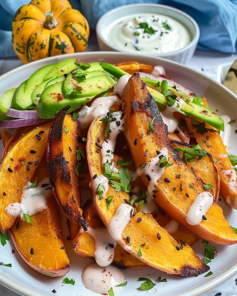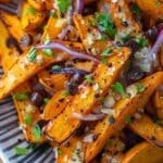 Crispy roasted pumpkin fries topped with spiced chickpeas and a creamy tahini yogurt sauce, delivering a warm, comforting, and flavorful plant-based dish. Perfect as a snack, appetizer, or light meal.