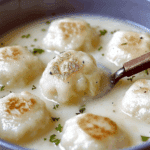Cook dumplings: Bring a pot of salted water to a gentle simmer. Shape dough into walnut-sized dumplings and drop into water. Simmer 6–8 minutes until they float and are firm. Remove with slotted spoon and set aside.