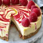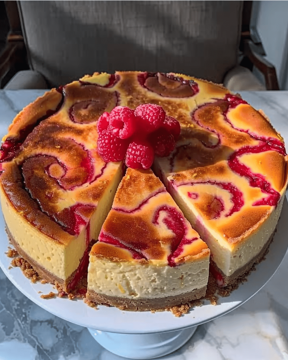 A creamy cheesecake with a buttery graham cracker crust, swirled with tart raspberry and fresh lemon for a vibrant, refreshing dessert perfect for any occasion.