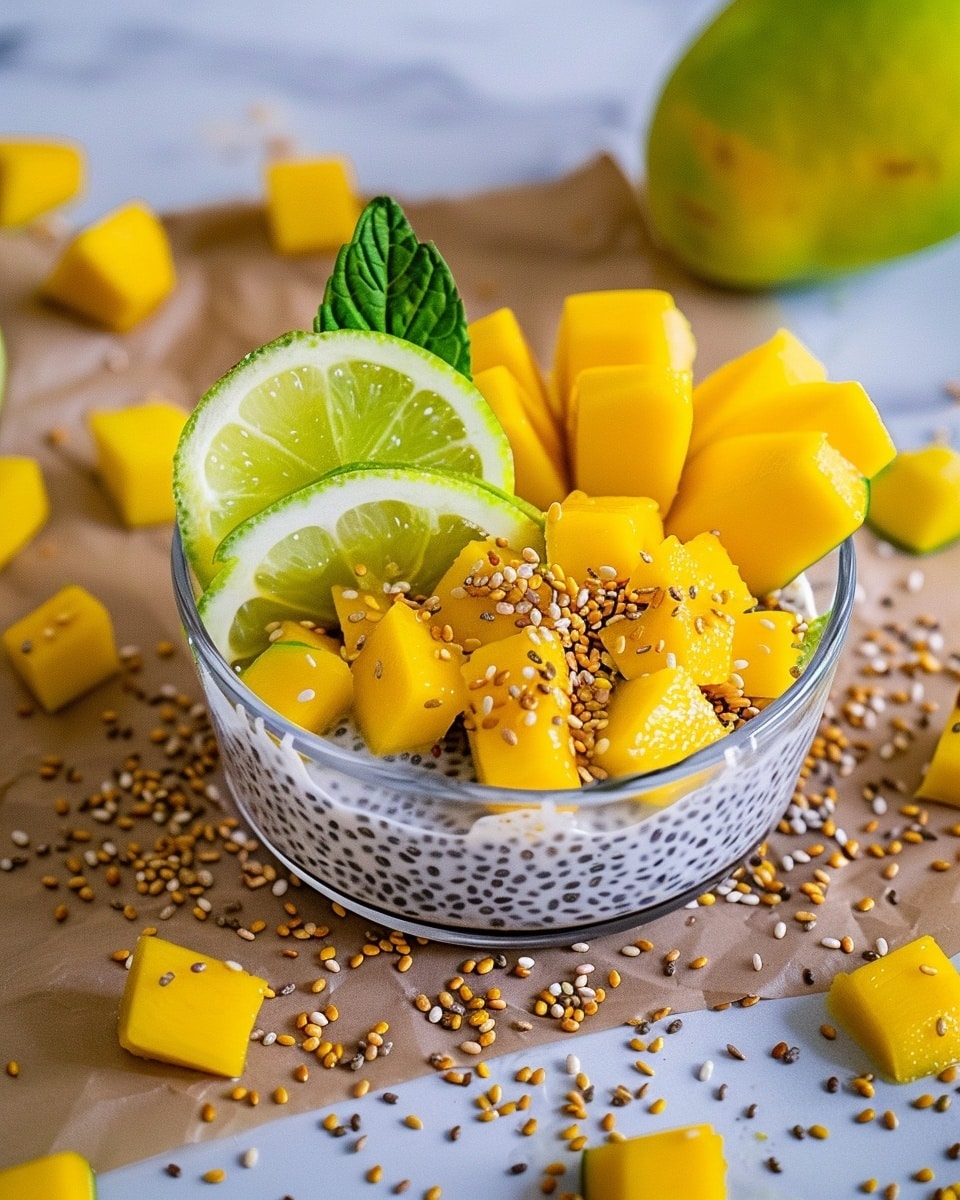 This recipe is incredibly easy to prepare and requires minimal effort. You simply mix the ingredients and let time do the work. It’s also a wholesome option, rich in fiber, healthy fats, and natural sweetness from mango. The creamy texture combined with juicy fruit and a hint of coconut makes every spoonful delicious. Plus, it’s versatile enough to customize with your favorite toppings.